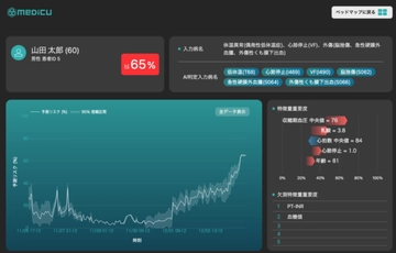 膨大な生体情報を基に、患者の転帰に関する統計情報を提供することで、ベッドコントロールを含む院内業務を支援。多施設データによる予測スコア